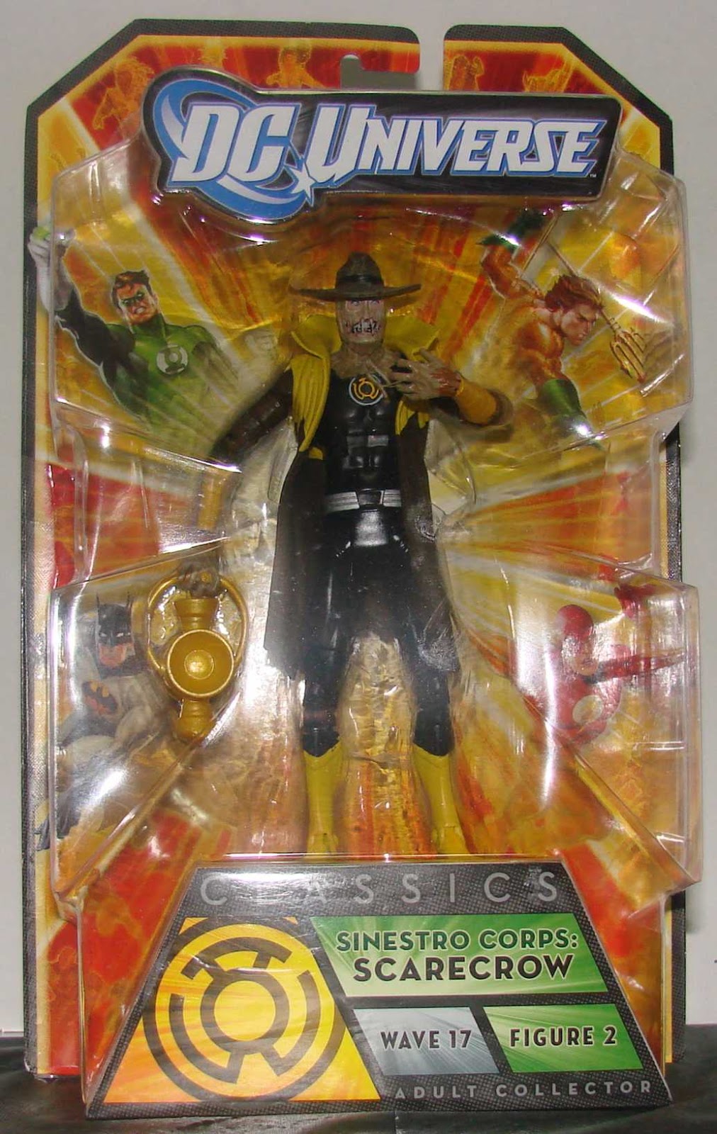 This guy is freaking awesome. First off Scarecrow has 13 points of articulation. I have to give Mattel credit where credit is due. They go all out on articulation on Skinny Whimpy Girly Man Figures. A knee joint and elbow joint. Its just awesome. Wish they would do it with the beefier characters. The only issue I have with the figure are the "Boo" hairy hands. While understandable for zombies, Mattel could have given him a slightly closed hand to hold his lantern properly. The over all look of the figure looks really close to its Comic representation. the yellow and Black Sinestro corps Uniform looks good on scarecrow.